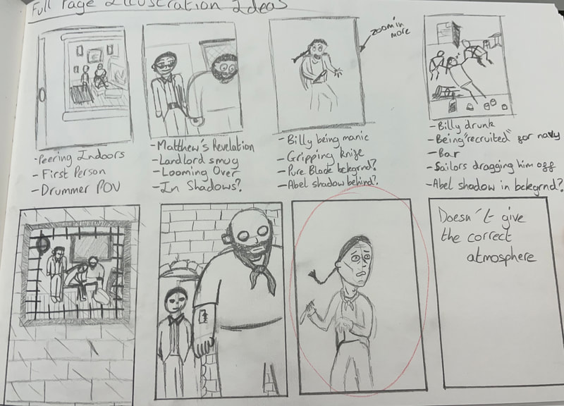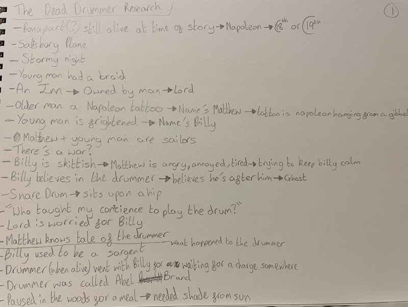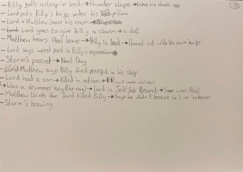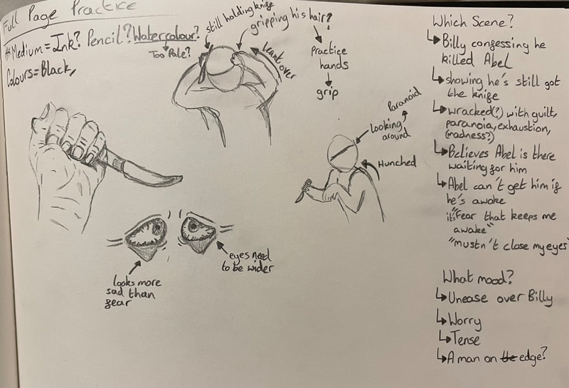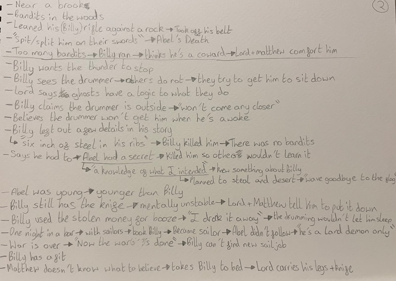 First, I listened through the audio and wrote down what happened and what stuck out the most to me as well as things such as setting descriptions, appearance descriptions and other details to help with illustrating the scenes.