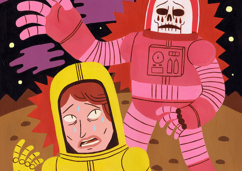 The third piece is an acrylic with the attempt of implementing the work of Jack Teagle. I tried to implement his work by trying to keep that cartoon feel of it and keeping it flat as well as using the lack of outline. The colours work well together and the shadow is quite nice however I could've worked more on the darker outlines such as maybe had them give more of a sense of direction or perhaps kept them all the same width since some seem to change widths as the line continues.