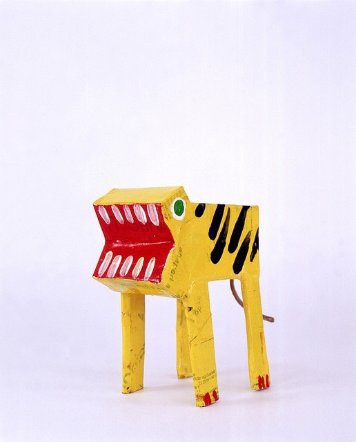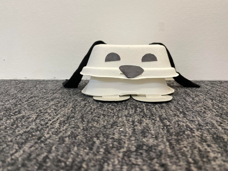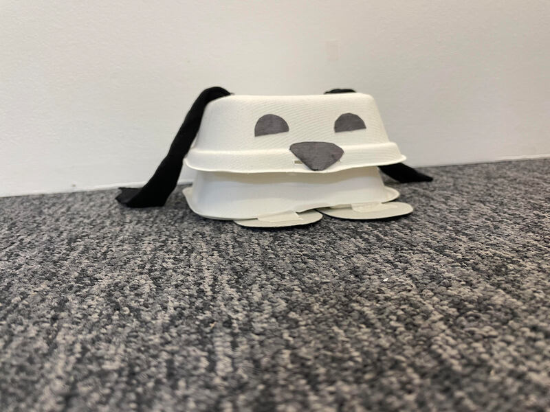 The animal at the top is a dog. The dog is composed of a lunchables container, some cardboard, a food container and two pieces of tights. I attempted to capture the essence of a dog by having the piece seem as though it's a dog laying down and you're looking at them from the front, therefore the ears would be at the side drooping down and the paws would be at the front.