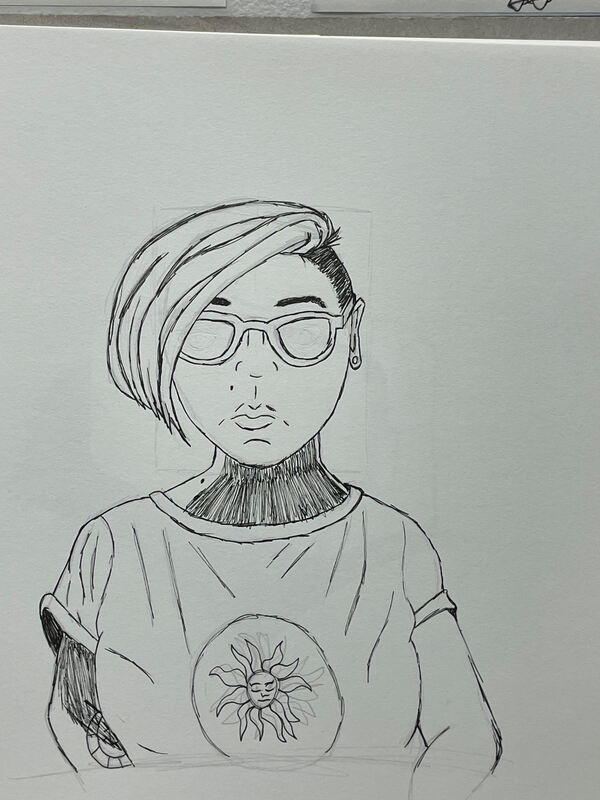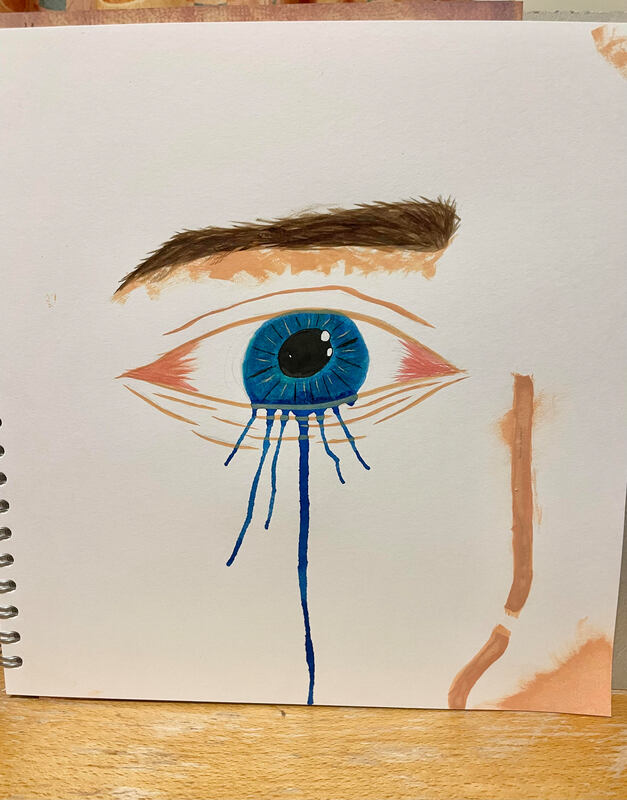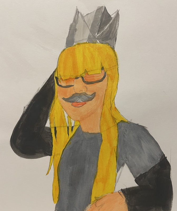 The fourth piece is an acrylic with the attempt of implementing the work of Jack Teagle once more. This time I tried to implement his work onto a portrait piece of a photo of my friend. I continued with wanting to keep the cartoon feel as well as the sense of flatness of the piece with an attempt of having no outline. I think that while the colours look vibrant and you can tell at least that this is meant to be a person, I feel that to improve I could've maybe tried more to hide that pencil outline or perhaps tried to have more control over the paintbrush.