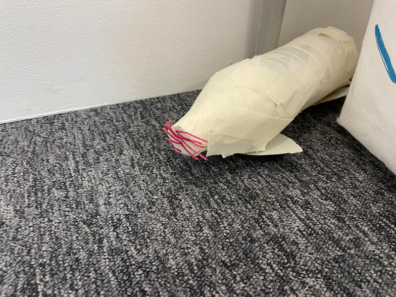The animal at the bottom is a mole. The mole is composed of a empty juice bottle, some cardboard, a few pieces of thread and masking tape. I attempted to capture the essence of a mole by not giving it eyes as moles are known for being blind and keeping the animal small since moles can be around five to seven inches long.