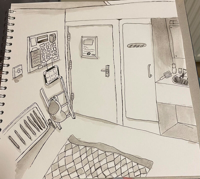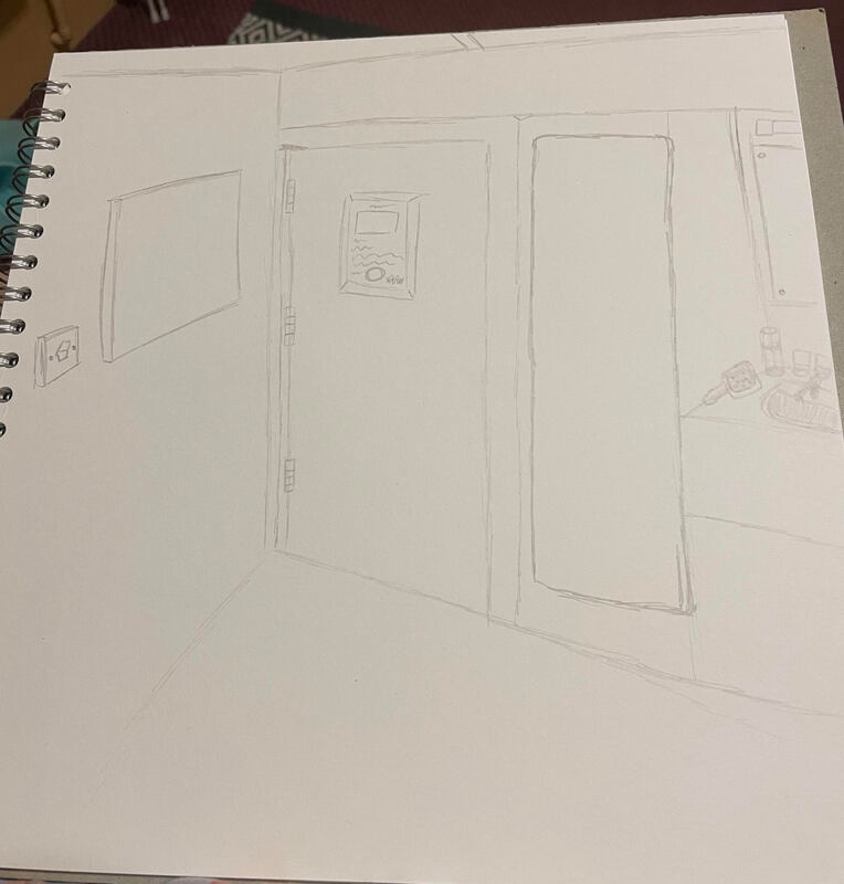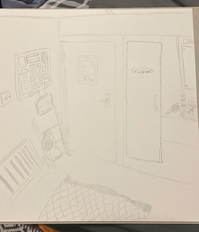 Above is my final piece being a corner of my room using both pigment liner and brush and ink. Overall, I would say it has gone well because the shading looks appealing and there is a slight sense of perspective, the use of greyscale is good and I think if I were to use other colours then it would either blend together too much or make the piece seem too busy so keeping it grey was a good decision. If I were to improve, I would work more on the lines because they're not really as straight as I would've liked them to be and I would try to make the piece seem a little more 3D as it's a little flat.